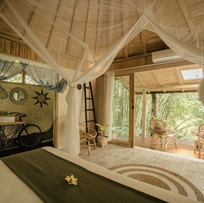 ° views with one-way mirrored floor to ceiling glass for the ultimate visual and private experience. Integrated underfloor heating and AC to cater for all year round retreats. Built-in voice controlled sound system, for the ultimate sensory and sensual experience. And a floating hammock balcony with a bubbling jacuzzi bath beneath, for a lazy jungle soak.